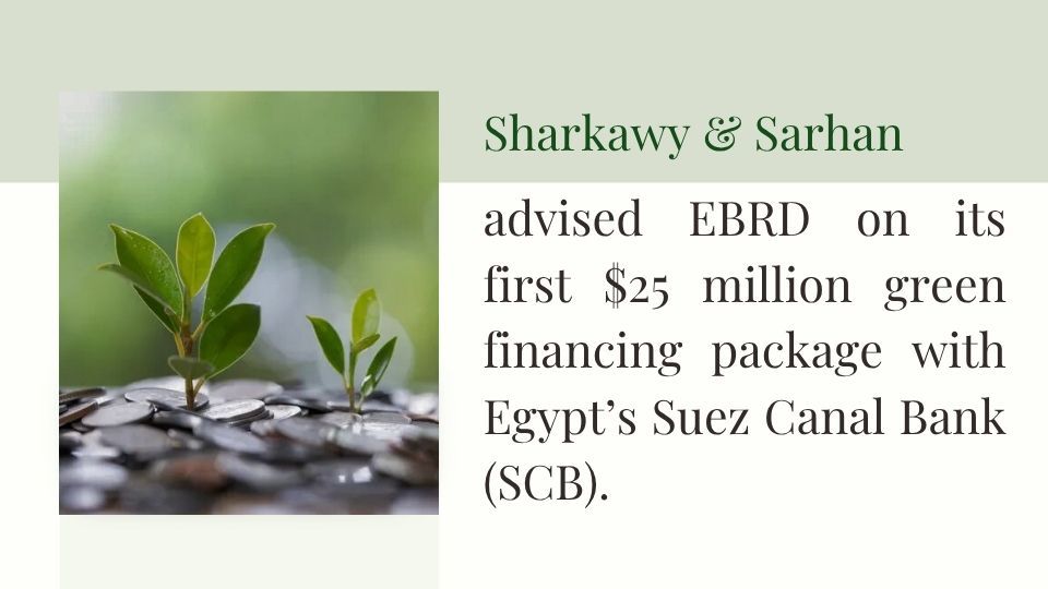 Sharkawy & Sarhan is honored to have advised the European Bank for Reconstruction and Development (EBRD) on its first $25 million green financing package with Egypt’s Suez Canal Bank (SCB) Gallery Sharkawy & Sarhan is honored to have advised the European Bank for Reconstruction and Development (EBRD) on its first $25 million green financing package with Egypt’s Suez Canal Bank (SCB) Client Alerts Sharkawy & Sarhan is honored to have advised the European Bank for Reconstruction and Development (EBRD) on its first $25 million green financing package with Egypt’s Suez Canal Bank (SCB) Toka Hassan2026-01-04T15:02:12+02:0024/09/2025| Read More