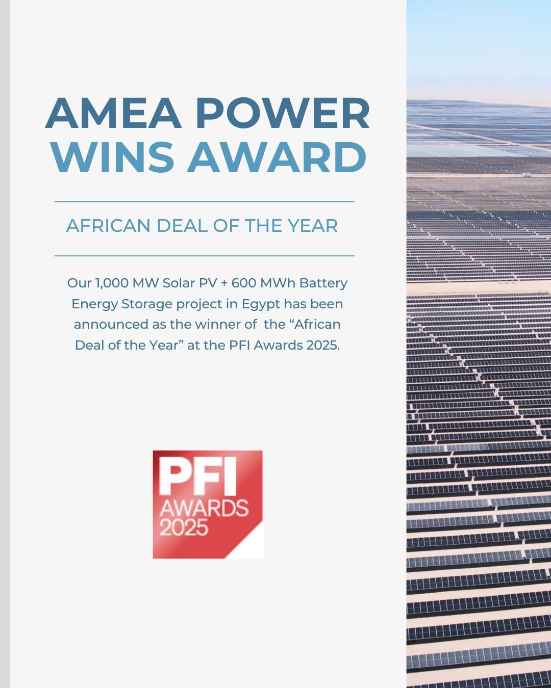 The African Deal of the Year 2025 was awarded to AMEA Power at the PFI Awards Gallery The African Deal of the Year 2025 was awarded to AMEA Power at the PFI Awards Our News The African Deal of the Year 2025 was awarded to AMEA Power at the PFI Awards Toka Hassan2026-01-28T09:06:56+02:0025/01/2026| Read More